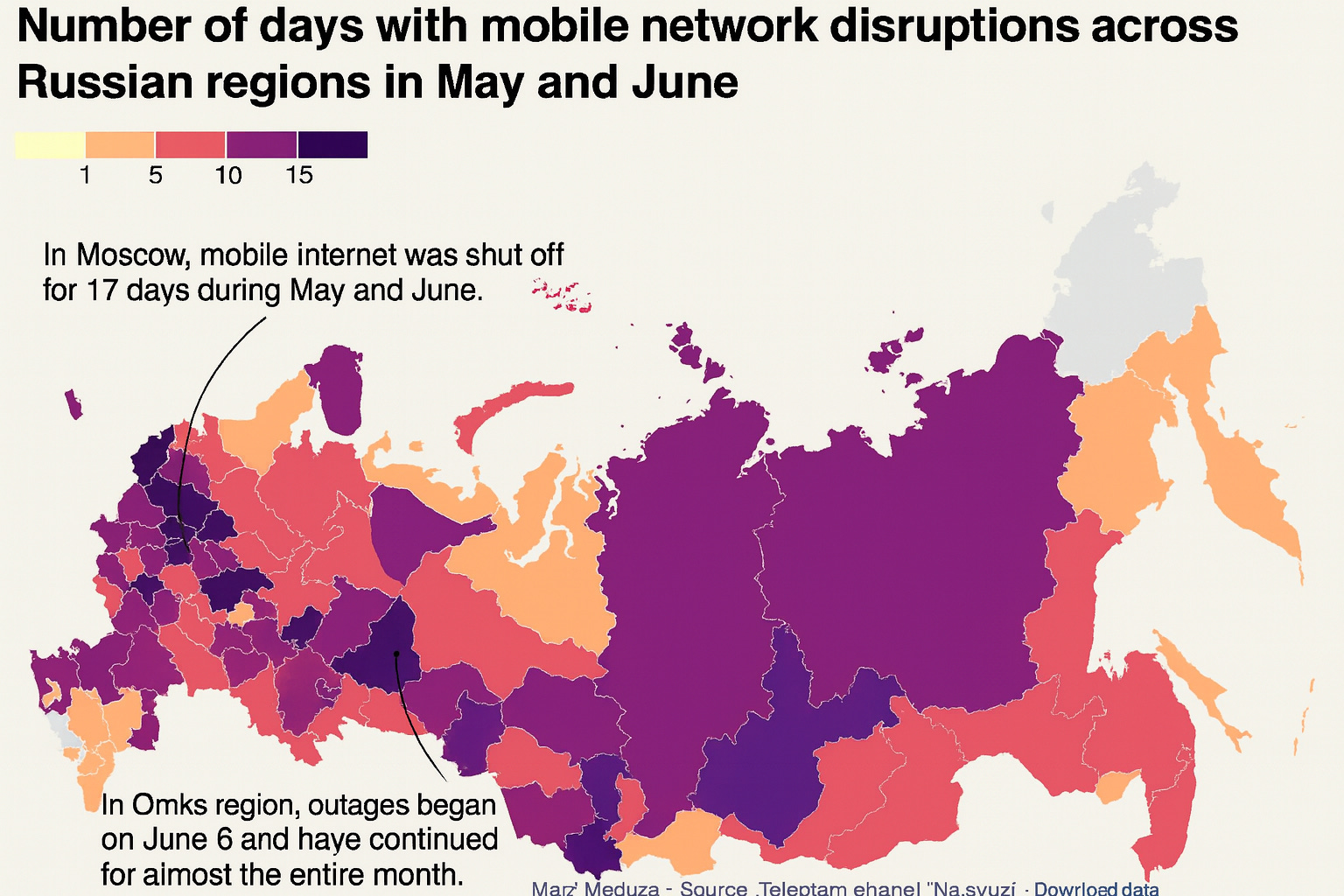 Total control is extending into the digital realm as well. Throughout the summer, regions across Russia experienced periodic mobile internet shutdowns — the independent monitor At Connection recorded over two thousand such incidents. Officially, authorities blamed these outages on “attacks by Ukrainian drones” that could allegedly use cellular networks for guidance. However, the timing of many shutdowns did not correspond to actual air-raid alerts, and their duration (sometimes several days) was clearly excessive for repelling drone raids. Even far-flung regions — from Bashkiria to the Far East, thousands of kilometers from Ukraine — were subjected to shutdowns. In some areas, mobile internet was down for multiple days straight (with record in Omsk region for almost entire month), causing everyday services to collapse: people couldn’t withdraw cash, pay for purchases via apps, or even open parking gates. Shutdowns hit both major cities like Moscow and St. Petersburg, and countryside.